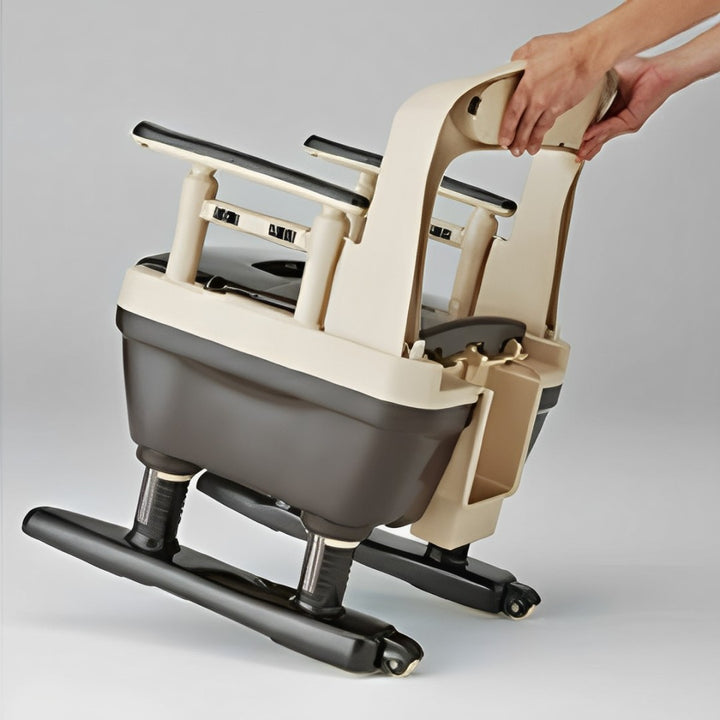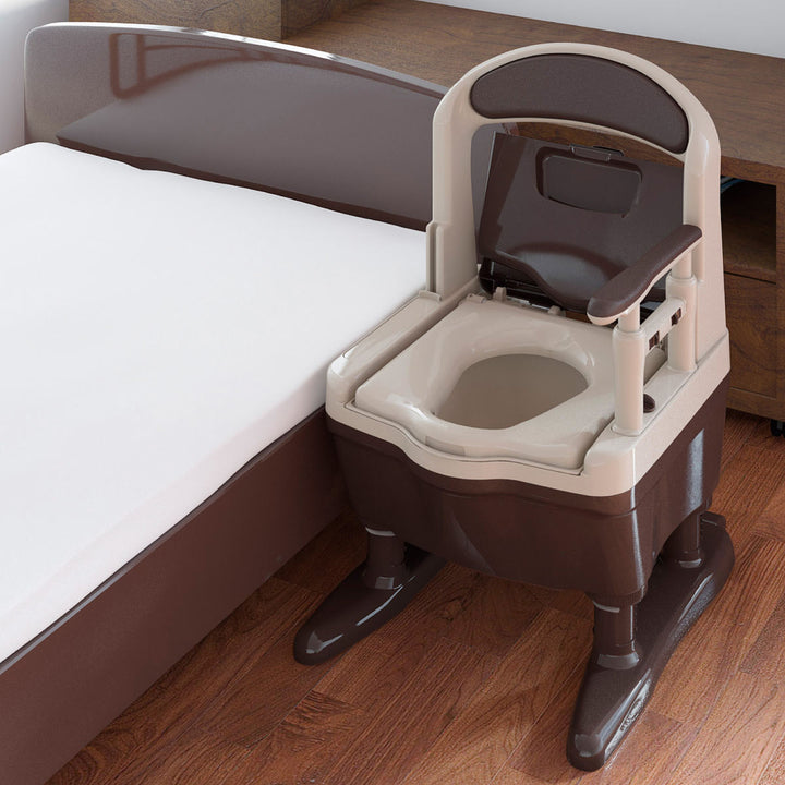 独自の形状で理想的な排泄姿勢に誘導し、尿こぼれを防止するポータブルトイレです。排泄時の失敗を防ぐことで、高齢者の自尊心を守るだけでなく、後処理をする介助者の負担も軽減します。