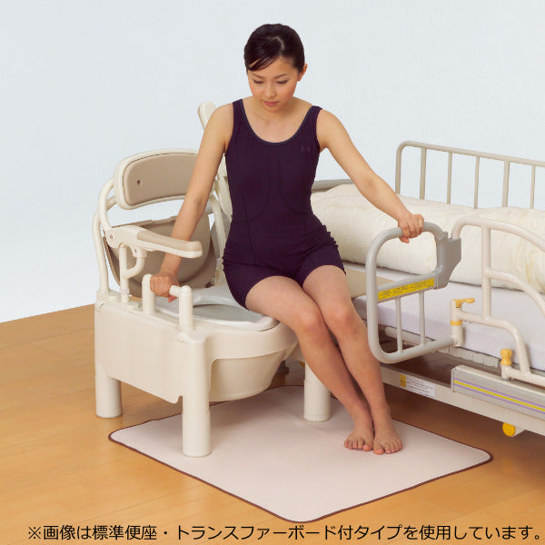 ●樹脂製ポータブルトイレ”ちびくまくん”シリーズのひじ掛けはね上げタイプです。
