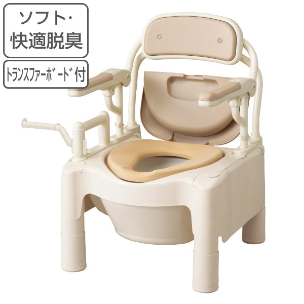 ソフト便座はやわらかく、冷たさを感じさせないEVA素材です。排泄のニオイを強力吸収・強力脱臭する快適脱臭機能と、ベッドからの移乗に便利なトランスファーボードが標準装備です。