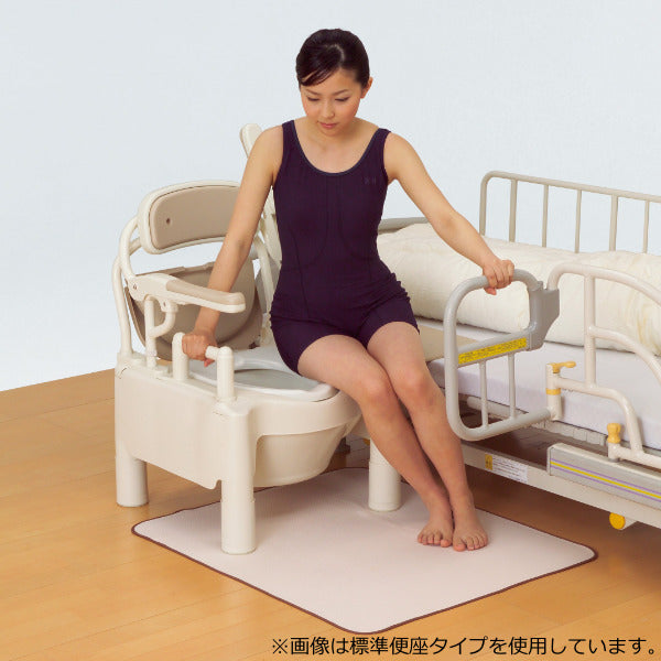 ●樹脂製ポータブルトイレ”ちびくまくん”シリーズのひじ掛けはね上げタイプです。