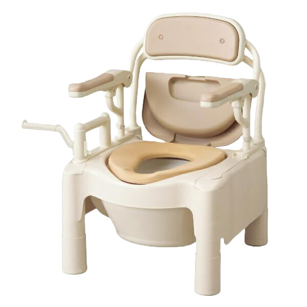 樹脂製ポータブルトイレ”ちびくまくん”シリーズのひじ掛けはねあげ式タイプです。移乗動作がスムーズに行えます。ひじ掛けはね上げタイプの中でも最小クラスの本体幅55cmです。