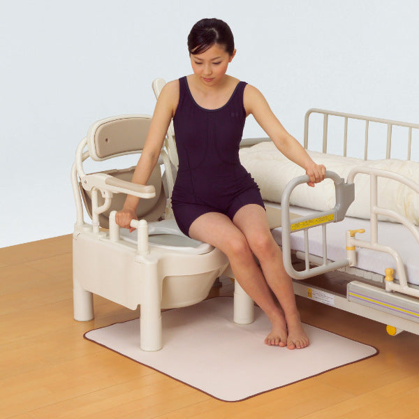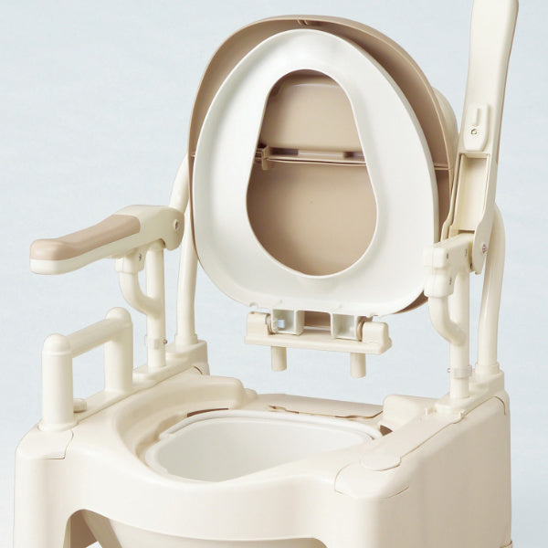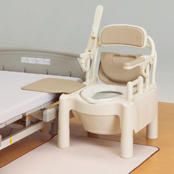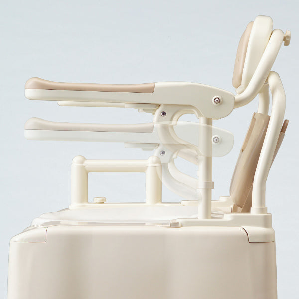 ●樹脂製ポータブルトイレ”ちびくまくん”シリーズのひじ掛けはね上げタイプです。