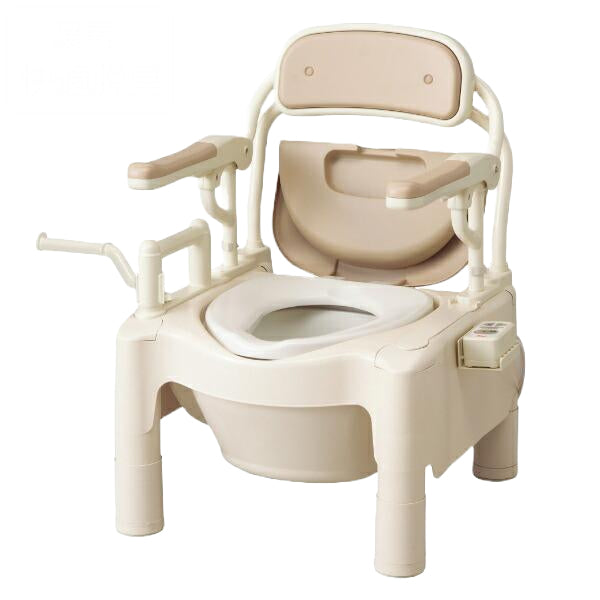 樹脂製ポータブルトイレ”ちびくまくん”シリーズのひじ掛けはねあげ式タイプです。移乗動作がスムーズに行えます。ひじ掛けはね上げタイプの中でも最小クラスの本体幅55cmです。