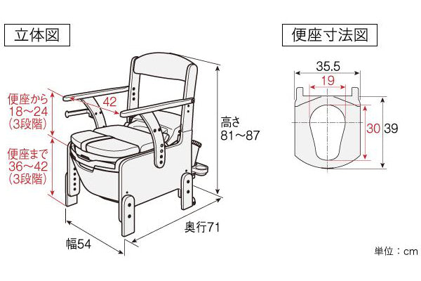 | サイズ | 約 幅54×奥行71×高さ81~87(cm) 便座までの高さ:36、39、42cm ひじ掛け外寸:50cm |