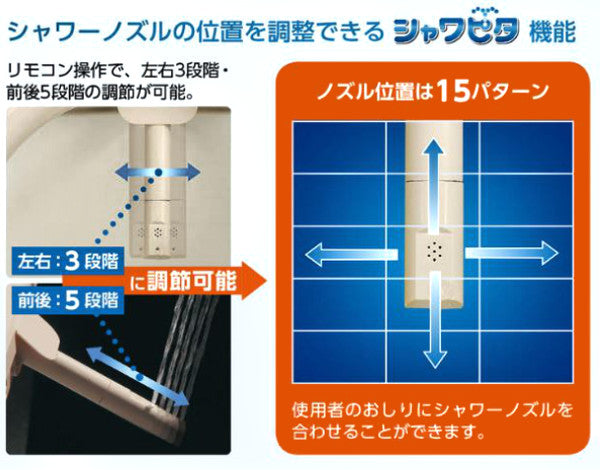 シャワピタ機能で前後左右にシャワーノズルを調整でき、座り直さなくてもおしりにシャワーがピッタリ合います。