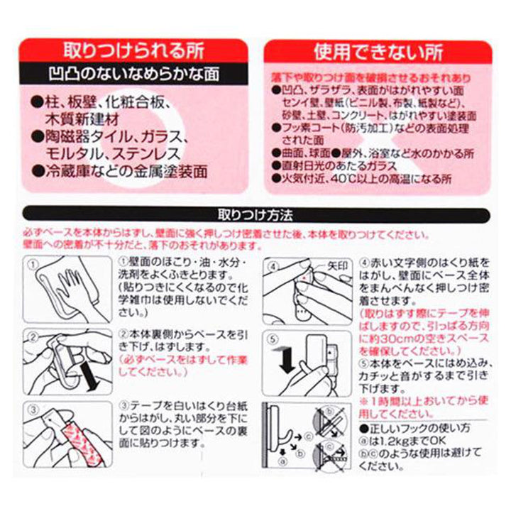 | 備考 | 【取り付けられる場所】 凹凸のないなめらかな面、柱、板壁、化粧合板、木質新建材、陶磁器タイル、ガラス、モルタル、ステンレス、冷蔵庫などの金属面 |