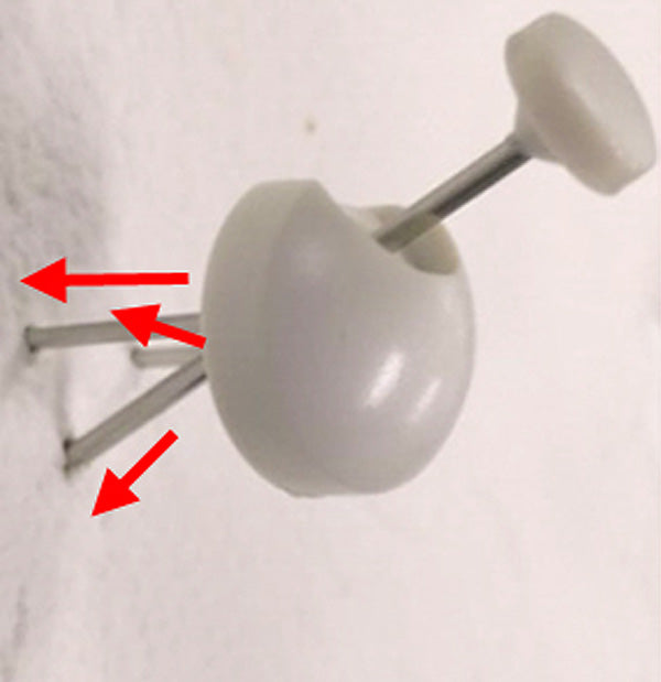 取り付けは簡単!画びょう感覚でクイッと押すだけ。3本のピンがしっかりクロスして壁をキャッチ!細いピンでも安全荷重5kgで、かばんや衣類などを安心して掛けることが出来ます。