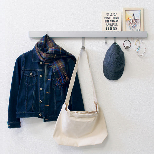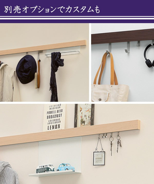 壁面に直接取り付けて使うスリム長押です。上着やコート、帽子やかばん、鍵など色々なものを掛けて収納することができます。また棚の上にイラストや写真を飾って、飾り棚としてお部屋のアクセントとしてもおしゃれな逸品です。