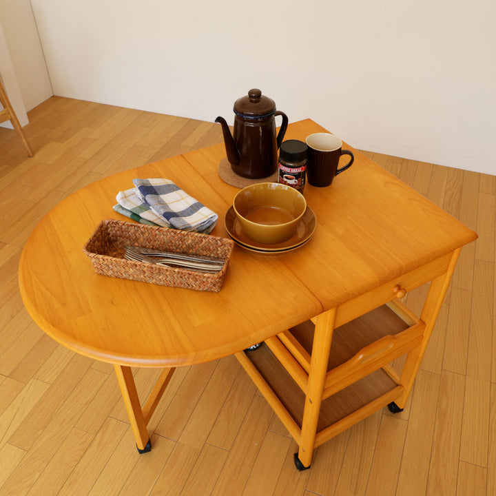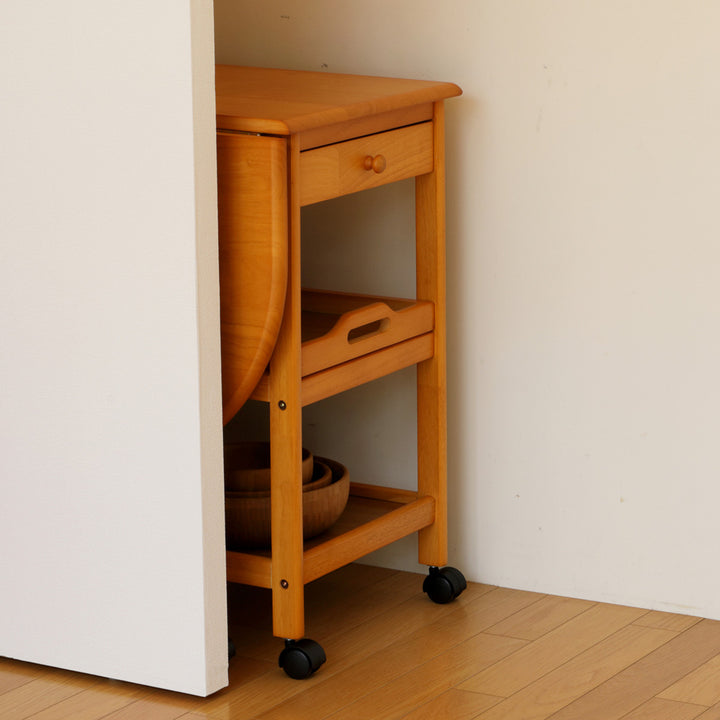 ナチュラルな雰囲気の天然木製です。キャスター付きなので、物を置いたままでの移動もラクラク。