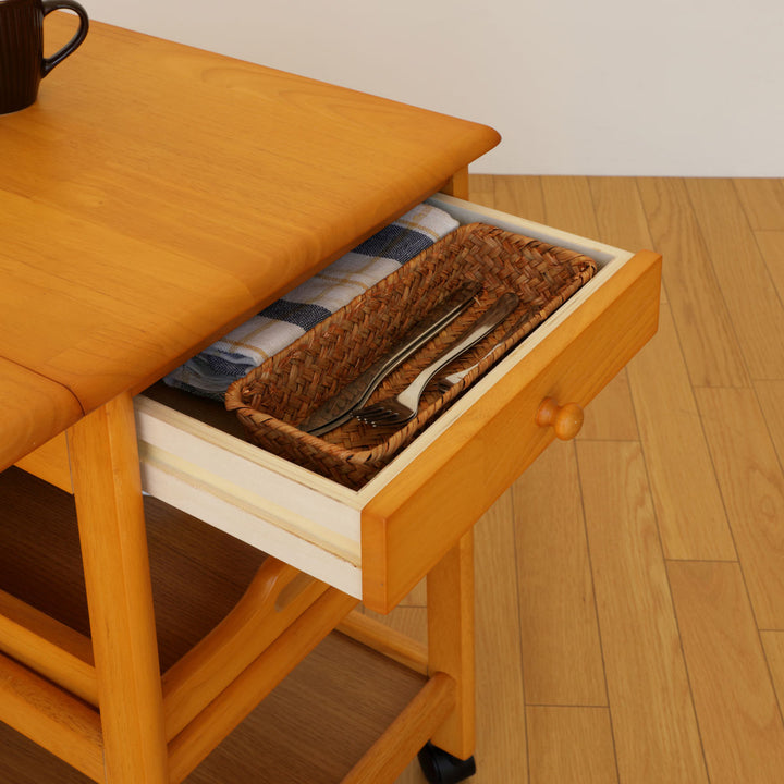 棚は取り外して、ハンディートレーとしてそのまま持ち運んで使うことができます。引き出しは、常時使うスプーンなど、カトラリーの収納に便利です。