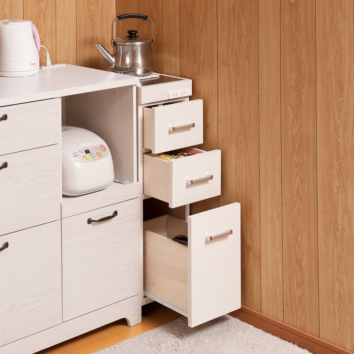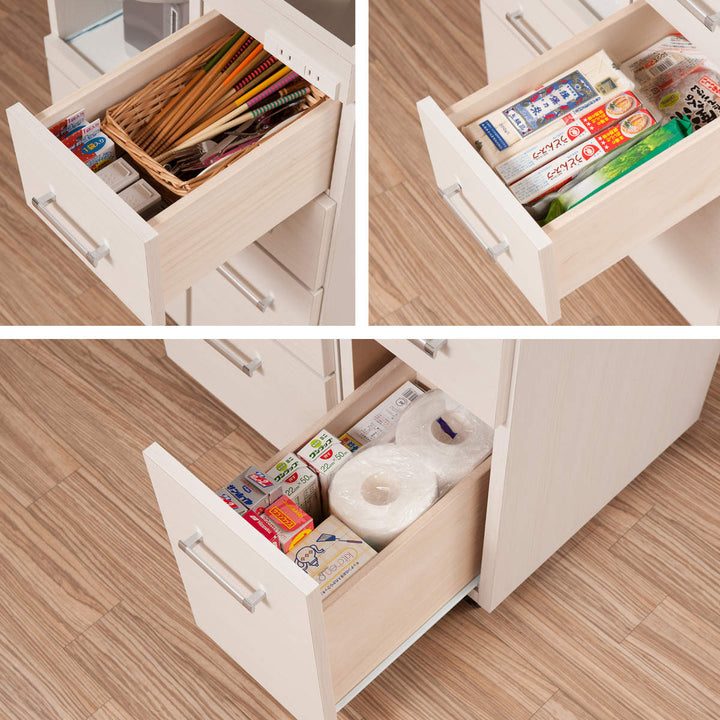 引出しは浅型2杯、深型1杯の合計3杯あります。浅型は2杯あるので、キッチンの小物をきれいに収納できます。深型は2リットルのペットボトルが収納できるレール付きの引出しです。ラップやキッチンペーパーなど消耗品のストック置き場としても最適です。