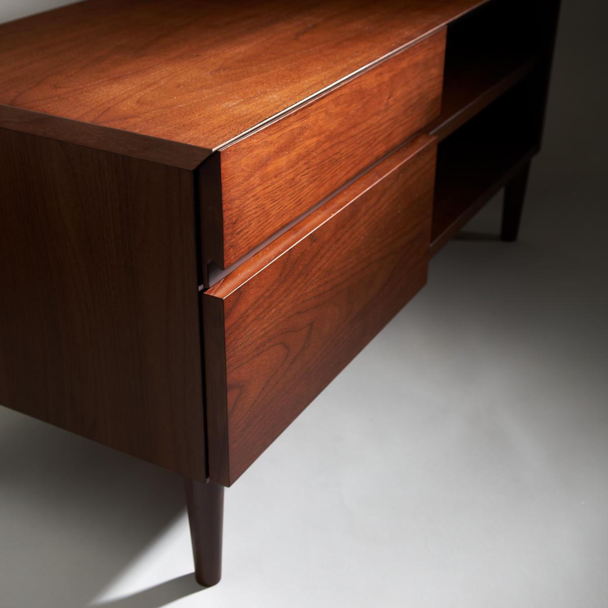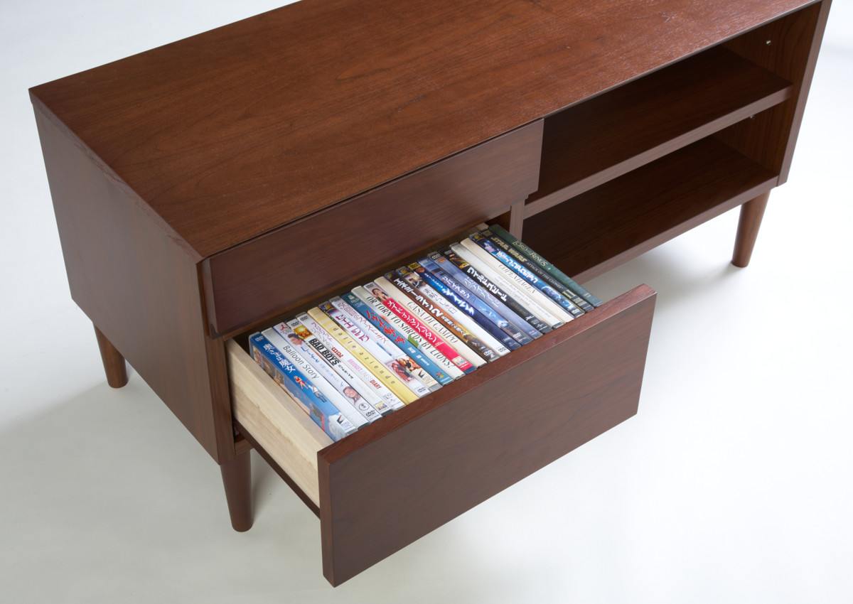向かって右側は可動棚板付きのオープン収納で、AV機器の熱もこもりにくく配線もしやすいです。左側は引出しが2杯付いており小物やDVDなどを収納できます。また、引出しはスライドレールなので、スムーズな開閉ができます。