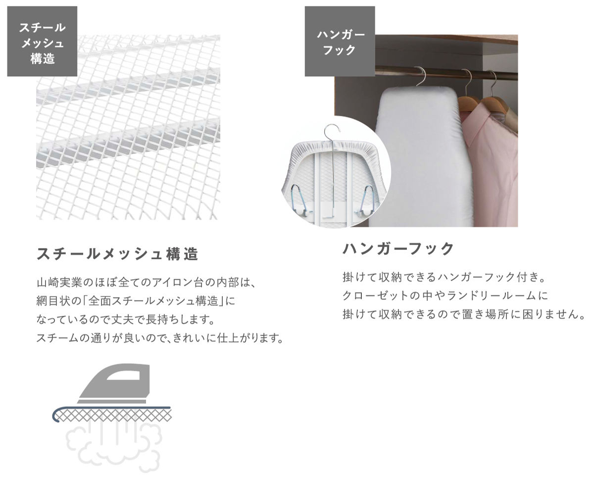 裏面はスチール製のメッシュ構造になっています。丈夫で、スチームアイロンの蒸気が通りやすい設計です。