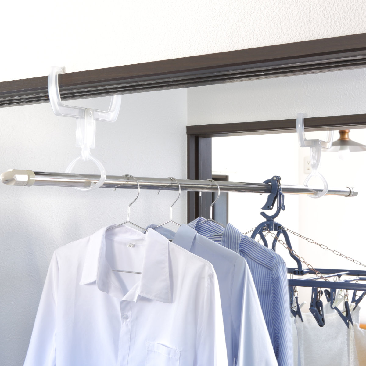 部屋干しクリップを2つ使用してポールや突っ張り棒を通せば、干せるスペースがさらに広がります。広くなったスペースにはハンガーの複数掛けができ、衣類を効率よく干すことが可能です。