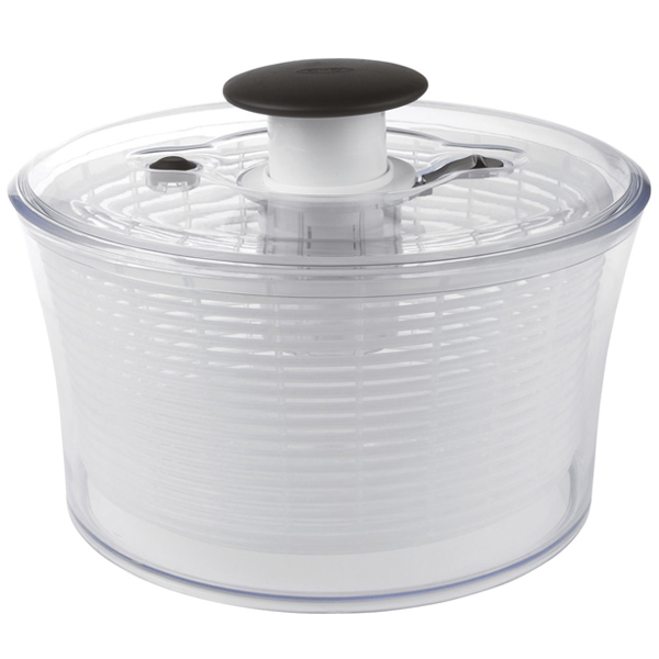 片手でノブを押すだけでカゴが回転して簡単に野菜の水切りができる、OXO人気商品のサラダスピナーです。濡れた手でも滑らず使いやすいノブです。ブレーキボタンを押せば、ぴたっと回転を止められます。少ない力で強力に回転し、回転中でも安定感抜群の形です。上から中身が確認でき、透明感のある全面クリアタイプです。