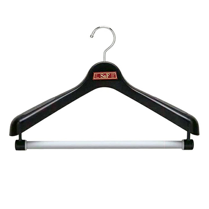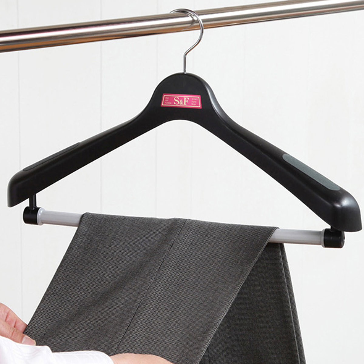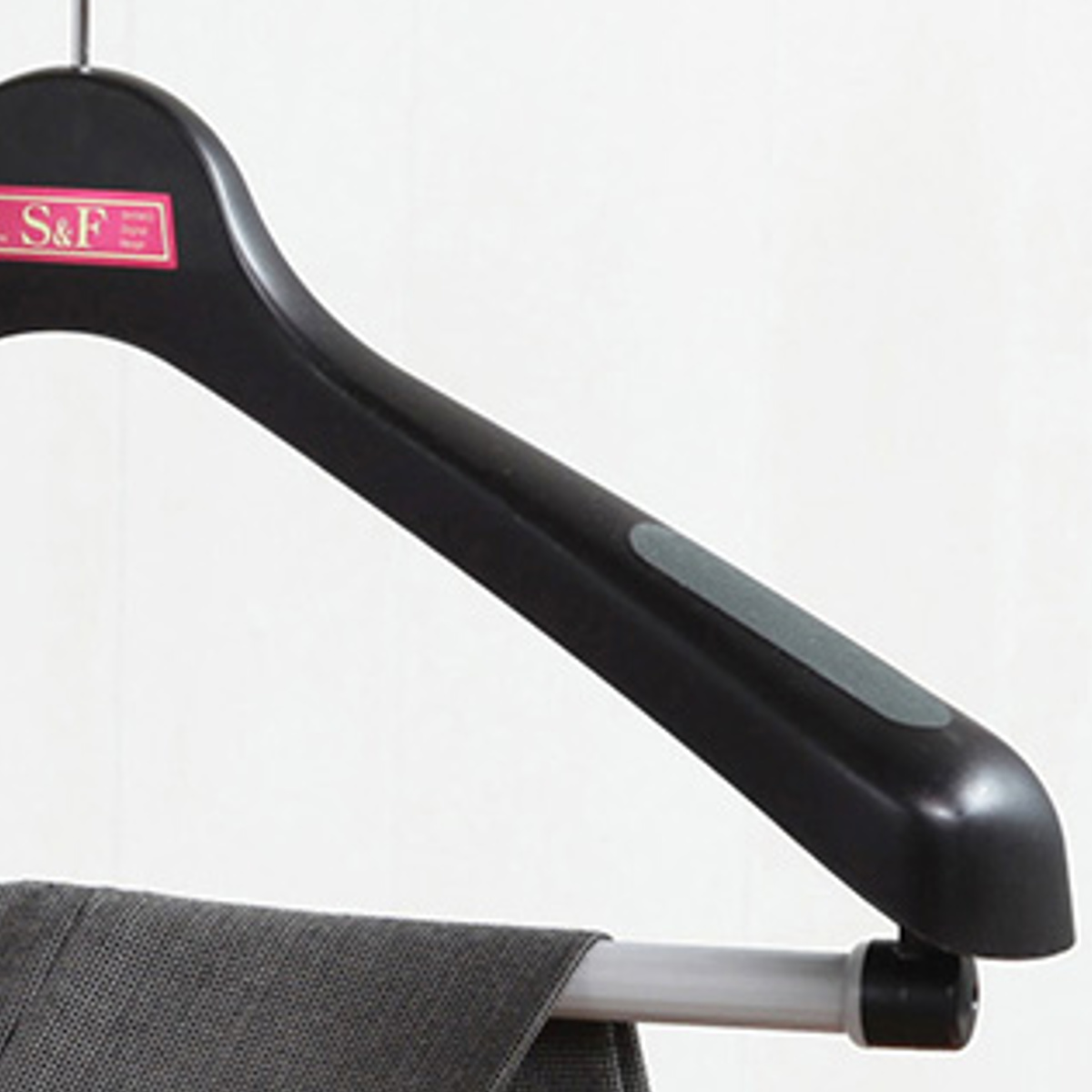 洋服を美しく保つ立体フォルムのジャケットハンガーです。スラックスが滑りにくく、引っ張るとバーが回転するので洋服が取りやすいです。