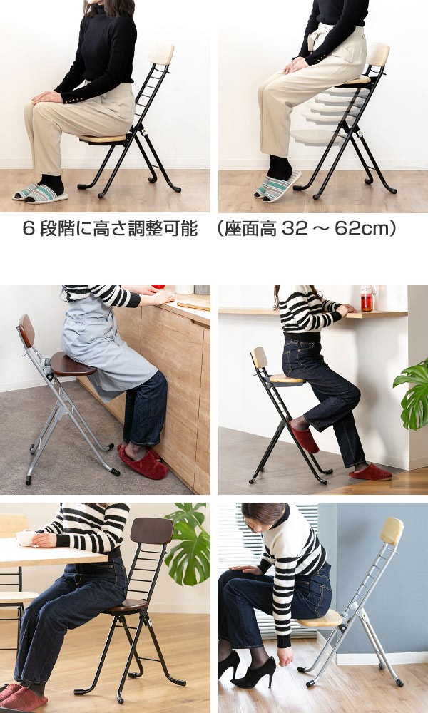 高め位置で、キッチンでの作業や、カウンターチェアとして。中ほどの高さで、来客時のダイニングチェアとして。低くして、ブーツを履くとき、腰がつらい低い位置での作業時に便利です。