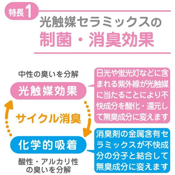 制菌効果のある光触媒セラミックスで捕集した粉じん中に含まれる雑菌の繁殖を抑えます。消臭効果もあるので、タバコ・ペットなどの気になる臭いも長時間シャットアウトします。