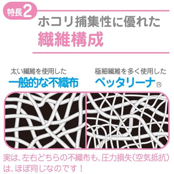 一般的な不織布よりも極細繊維なので不織布と空気抵抗はほぼ同じままで気流接触面積を増やし、微細な埃もキャッチします。