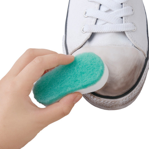 まず不織布面で靴のゴムの部分の汚れを綺麗に取ります。そのあと、メラミンスポンジ面でピカピカに磨き上げます。洗剤を使わずこれ一つで汚れを落とすことが出来ます。お出かけ前にサッと汚れを取ることができるので、急な靴の洗浄に役立ちます。