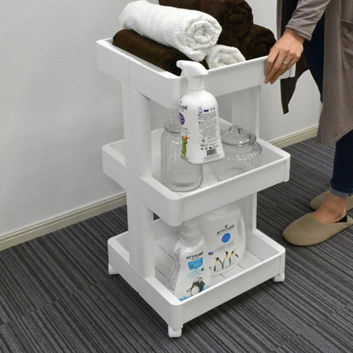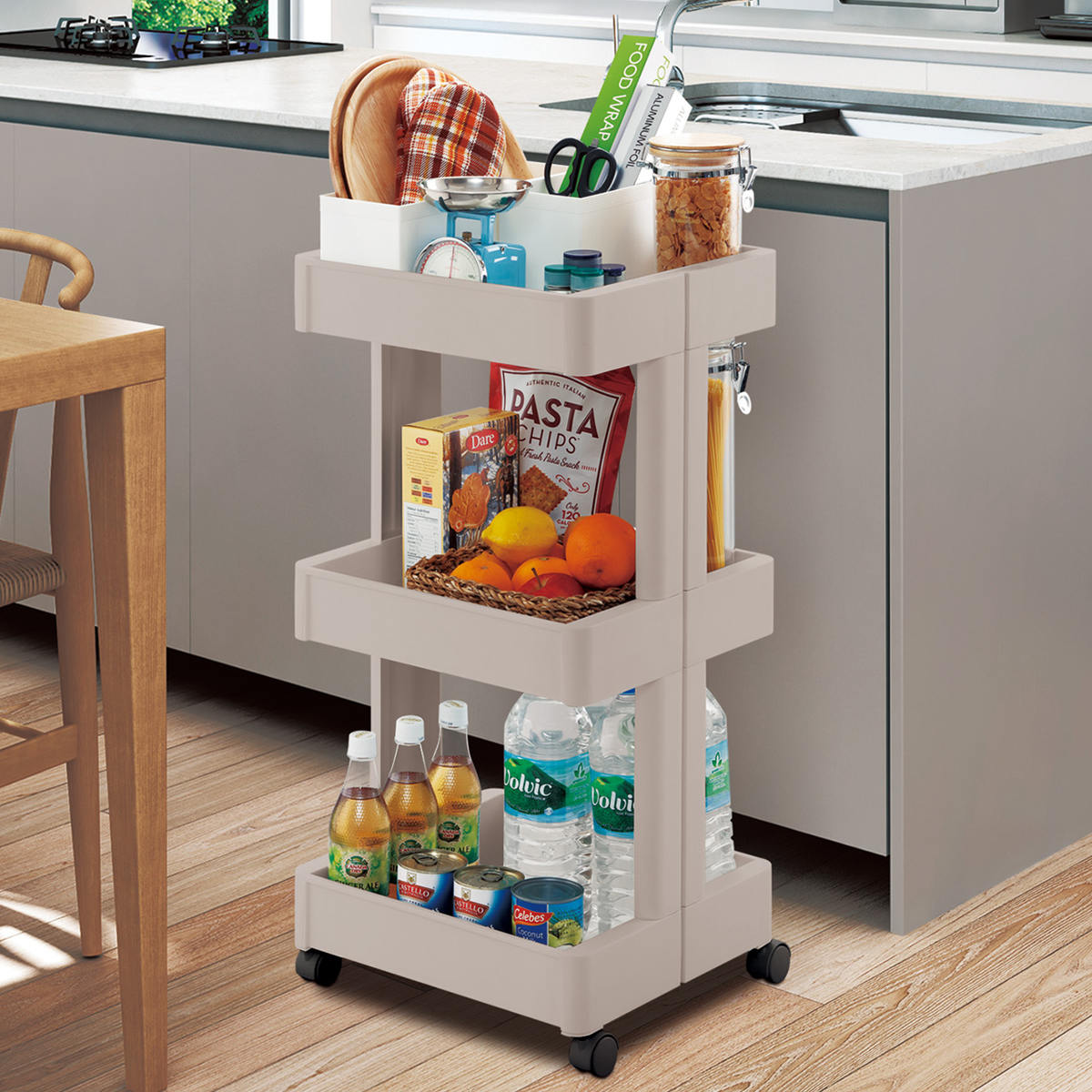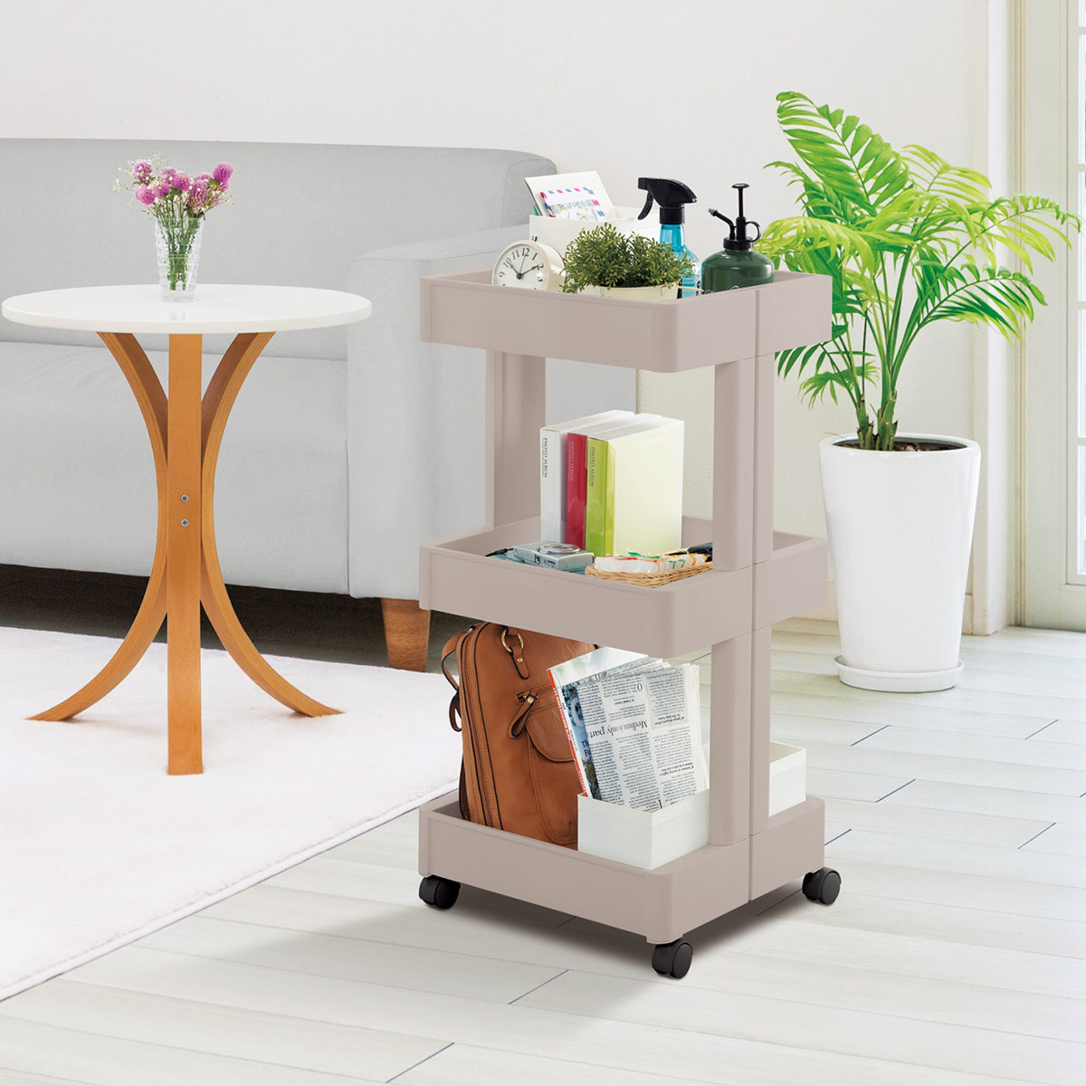 シンプルな形状とインテリアに馴染むカラーで、キッチンはもちろん、リビングやランドリールームなど、場所を選ばず便利にお使いいただけます。支柱が視界をさえぎらないので、サッと置いたアイテムもすっきりと片付いた印象になります。