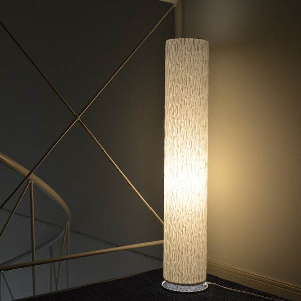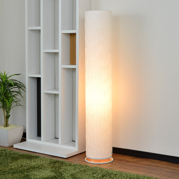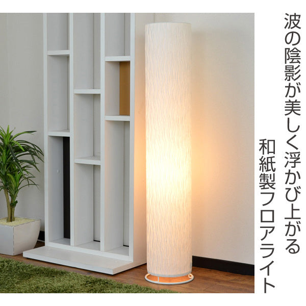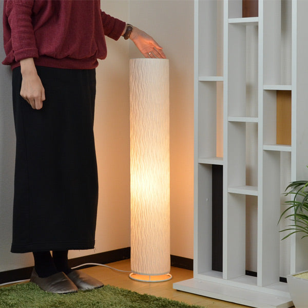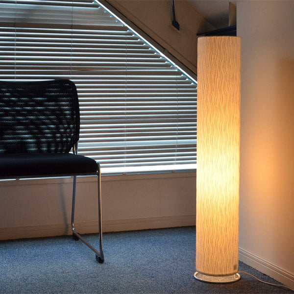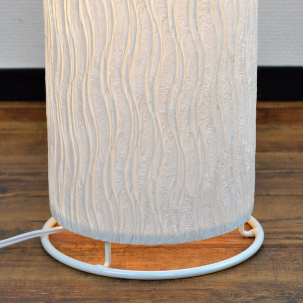 クシャクシャと揉みこんだようなウェーブ状にプリーツ加工された和紙を使用しています。洋服などにも使われる加工を施した珍しい和紙です。ライトの足の部分は円形になっており、安定感があります。
