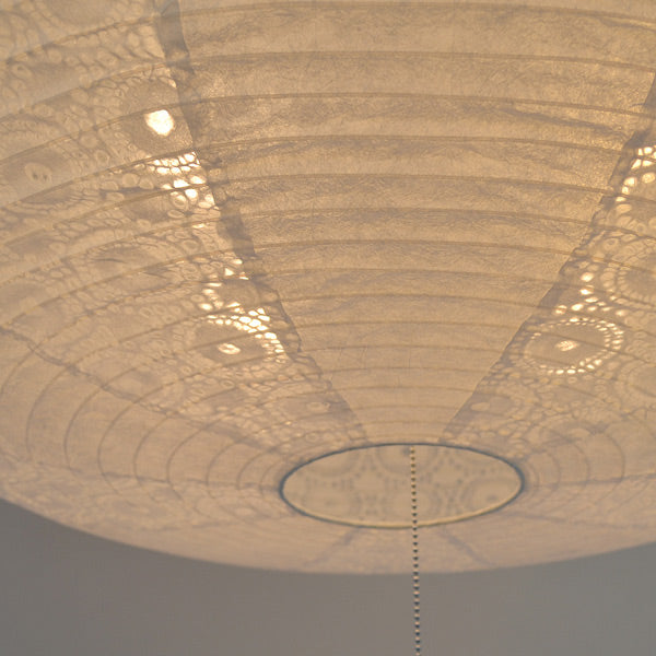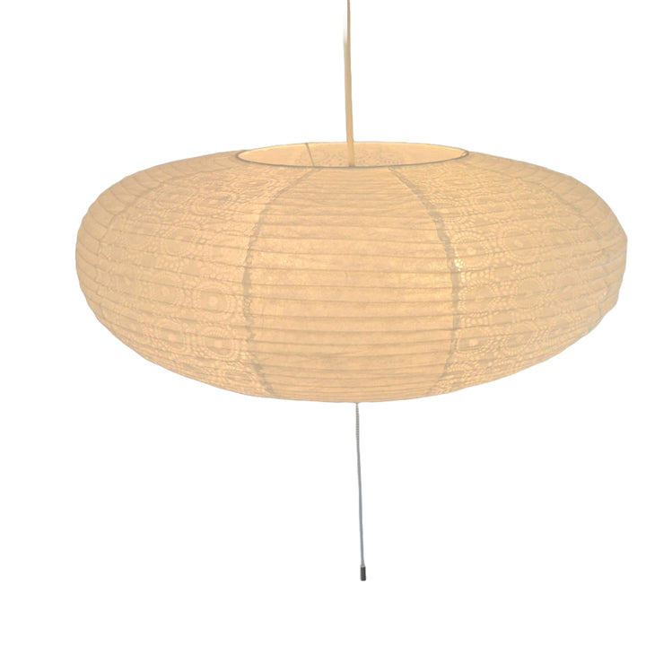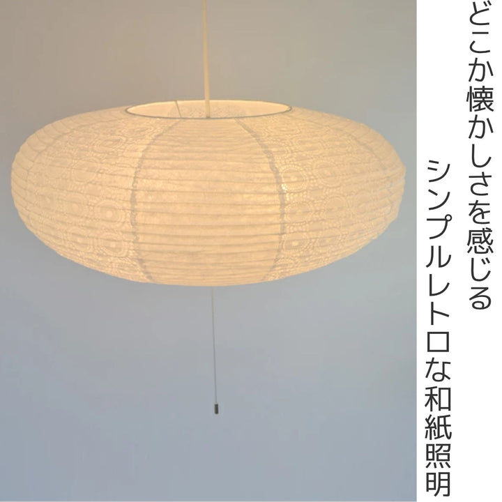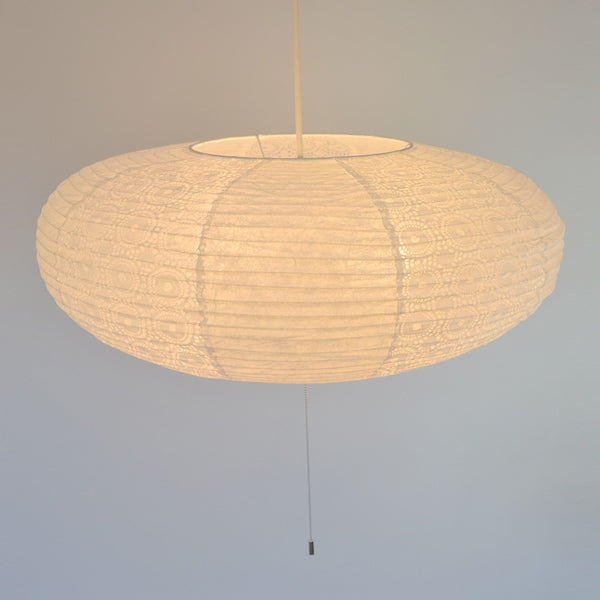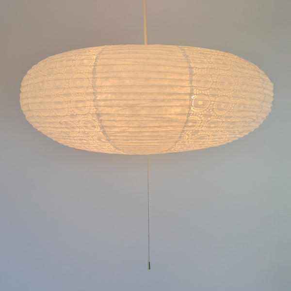 横に長い楕円の形がどこか懐かしいレトロさを感じさせるデザインです。柄の入った美濃手漉き和紙と揉みの入った和紙を使ったホワイト調のカラーはどんなインテリアとも好相性です。和紙を通した明かりはやわらかく、温かみがあります。一日の疲れを癒す空間を演出してみてはいかがでしょうか。
