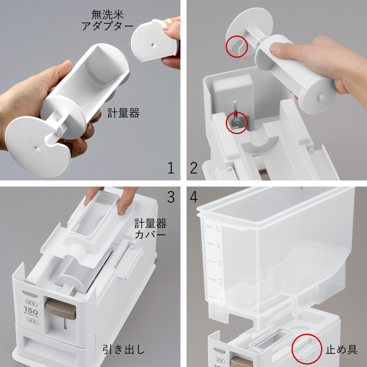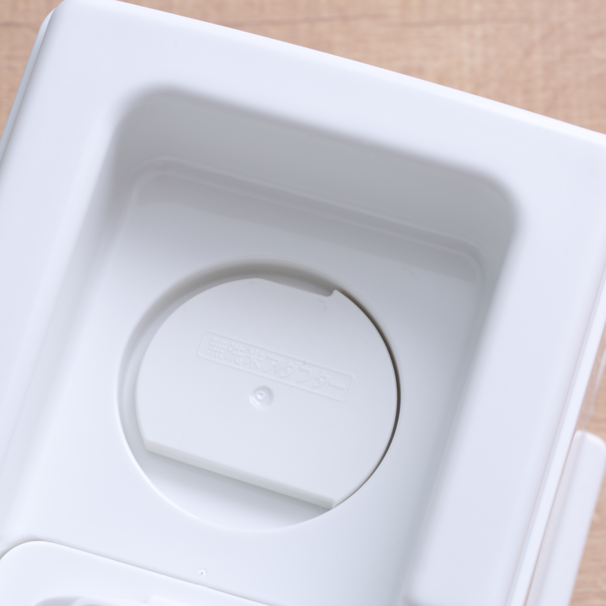 アダプターを取り付ければ、普通米だけでなく無洗米の計量にも対応できます。また、本体内にアダプター専用の収納場所があります。使用しないときに無くなってしまう心配がなく安心です。