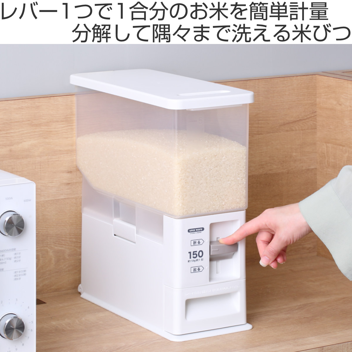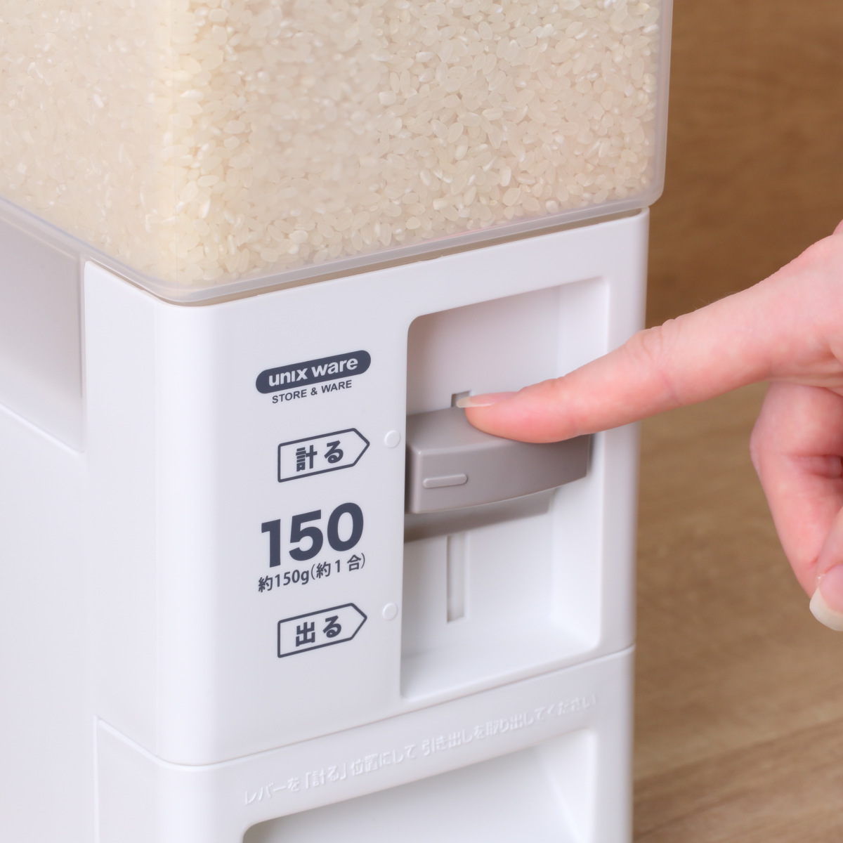 簡単なレバー操作でお米が計量できる計量米びつです。レバーを下げると1合分のお米が計量されます。計量のたびにフタを開けて計量カップで計るという手間がありません。簡単にお米が計量できるので、お子さまのお手伝いにもおすすめです。