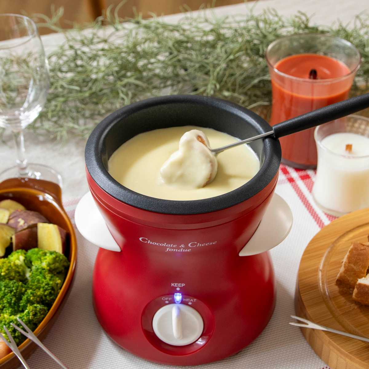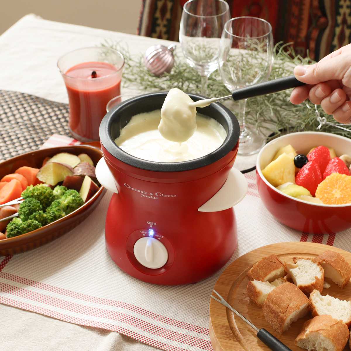 食卓を一気にパーティームードにしてくれるチーズフォンデュ。コンパクトサイズで置き場所に困らず、パンや野菜をたくさん用意してもスッキリまとまります。