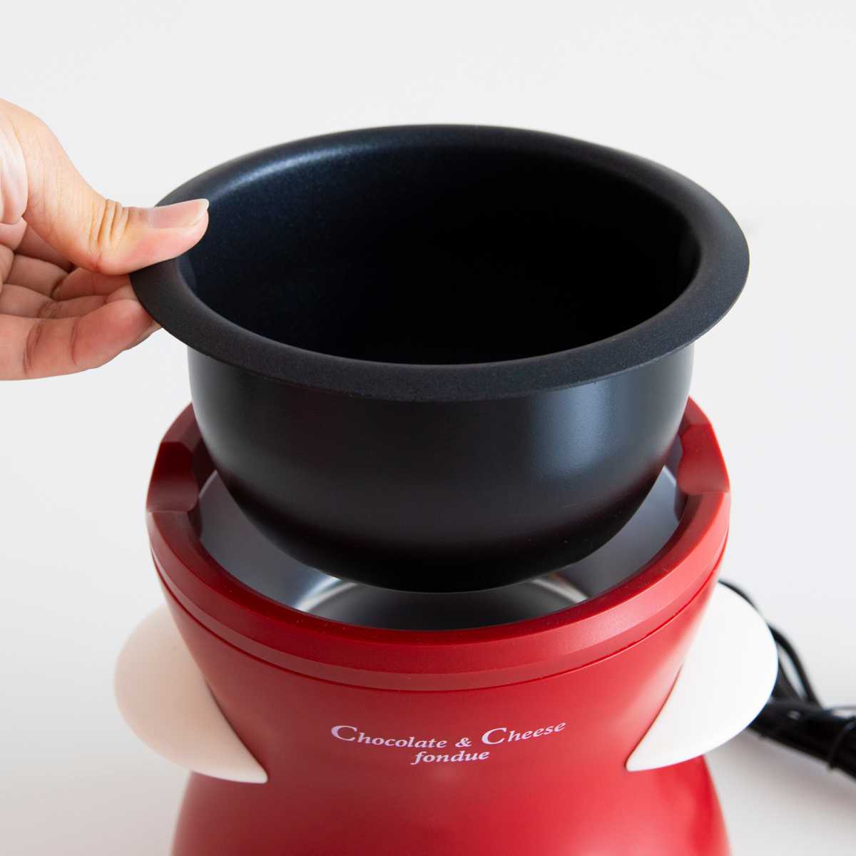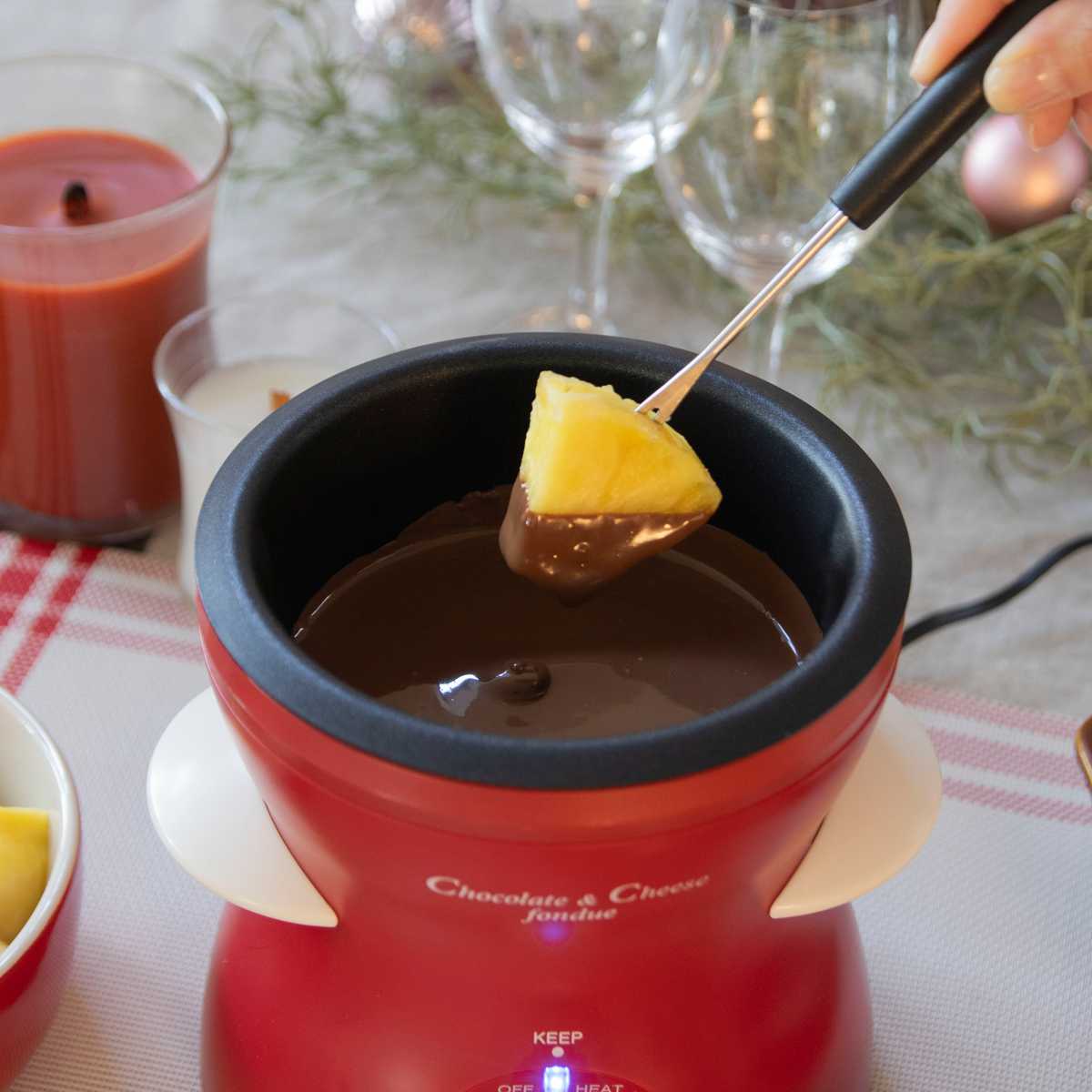 チョコフォンデュとチーズフォンデュが楽しめる電気フォンデュ鍋です。火を使わないので熱しすぎることもなく、一定の温度でいつまでも温かいので、チョコやチーズが固まりません。チーズやパンなどの食材を用意すればご家庭でも手軽に楽しめます。お誕生日会やクリスマス会などイベントには食卓が華やかになります。電気なので火を使わず、安心・安全です。