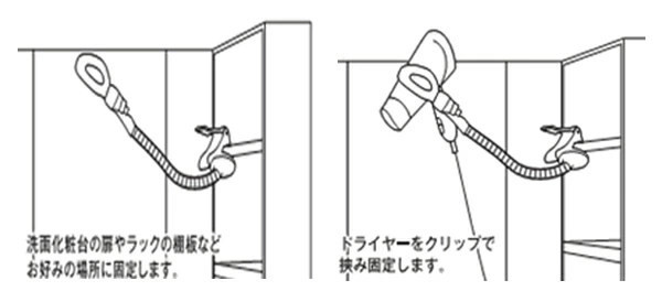 ●洗面化粧台の扉やラックの丸パイプ等にはクリップを挟んでドライヤーをしっかり固定できます。