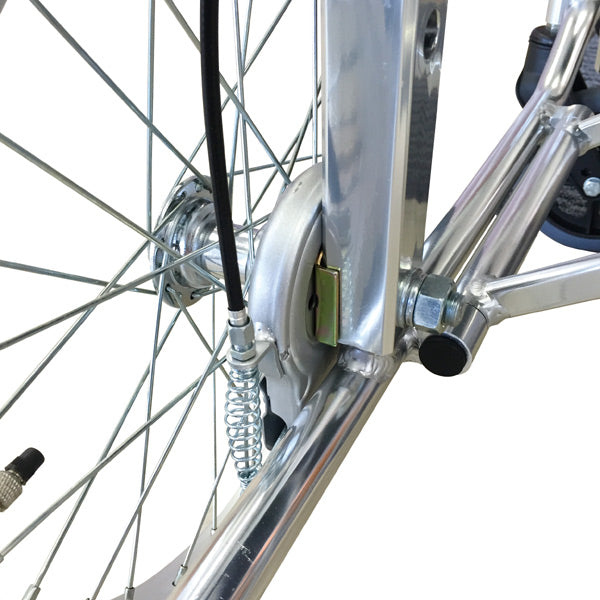 ●介助ブレーキ式・バンド式ですのでタイヤの負担も少なくしっかり止まります。