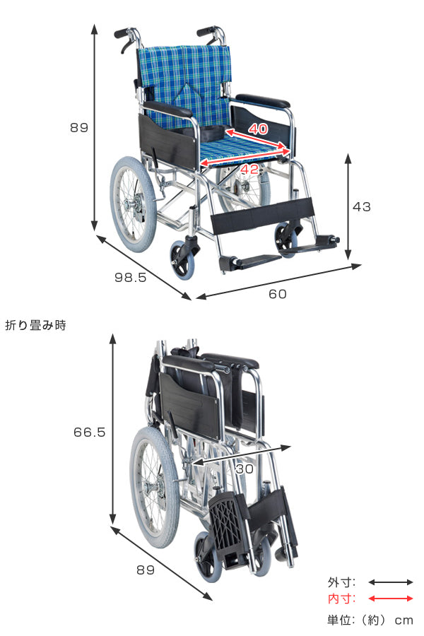 | サイズ | 約 幅60×奥行98.5×高さ89(cm) 折り畳み時:約 幅30×奥行89×高さ66.5(cm) バックサポート高39(cm) アームサポート高21(cm) 前輪6インチ・後輪16インチ |