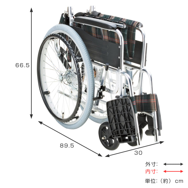 | サイズ | 約 幅69.5×奥行99.5×高さ89(cm) 前座高:43(cm) 折り畳み時:約 幅30×奥行89.5×高さ66.5(cm) バックサポート高43(cm) アームサポート高21.5(cm)前輪6インチ・後輪22インチ |