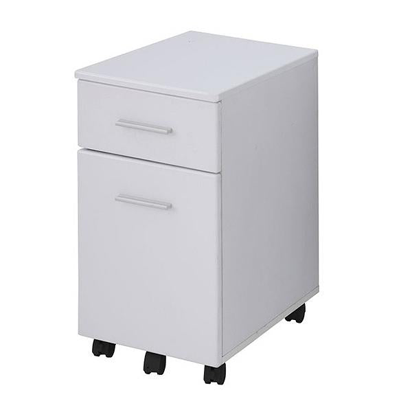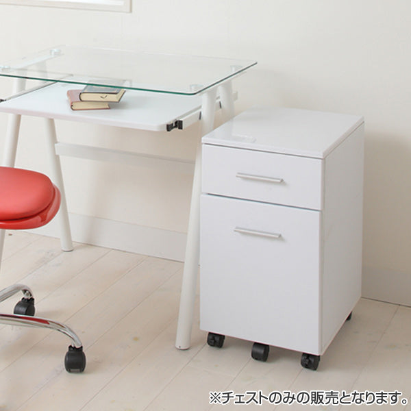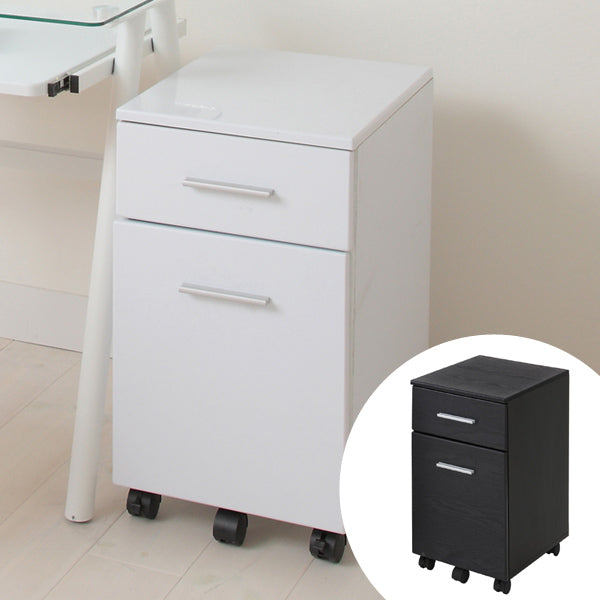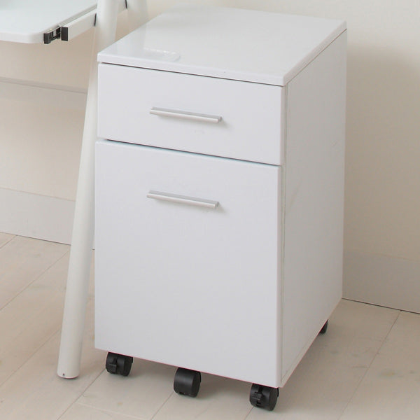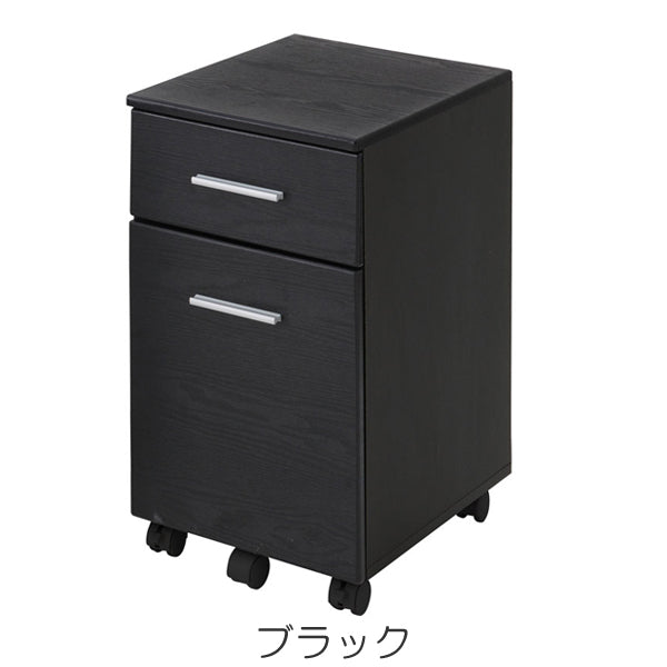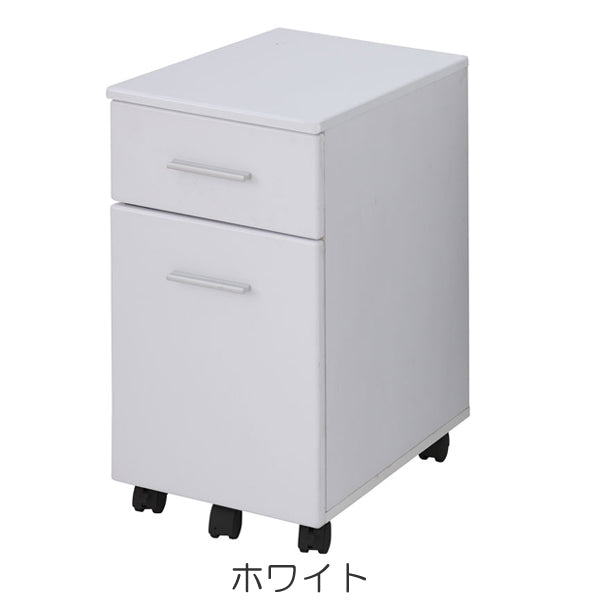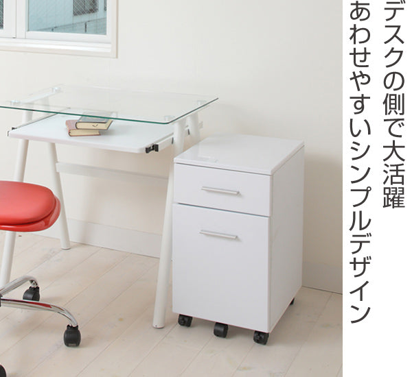 上段には筆記用具や小物類、下段には書類などが収納できます。底面にはキャスターがついているので、移動もラクラクです。