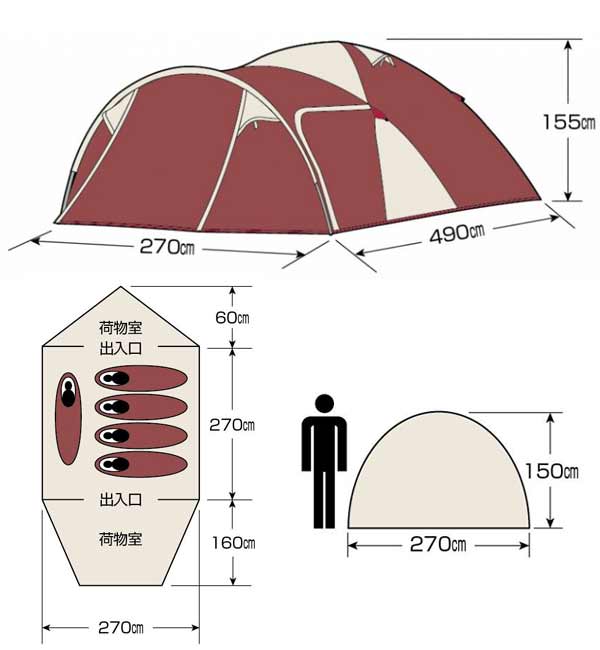 | サイズ | フライ:約 幅270×奥行490×高さ155(cm) インナー:約 幅270×奥行270×高さ150(cm) キャリーバッグ:約 幅58×奥行20×高さ20(cm) 重量:約6.6kg |