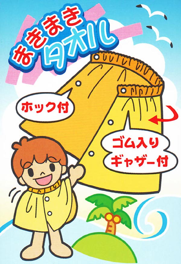 ●スナップボタンでとめられ、まわりを気にせず着替えられるラップタオルです。