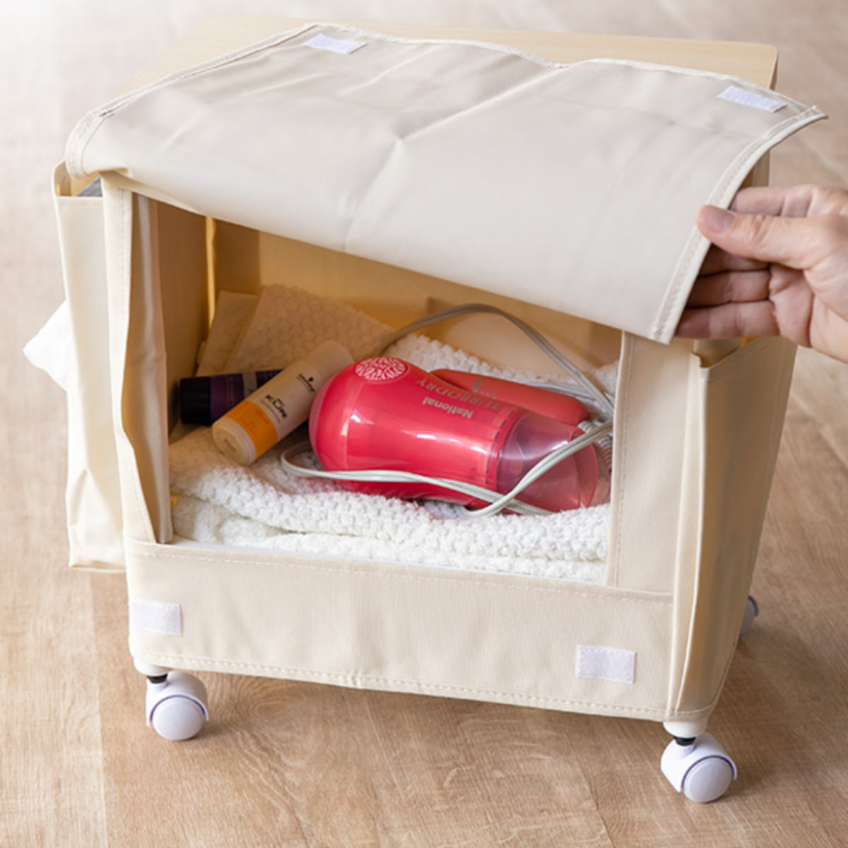 バケット部分はカバー付きでワゴン内の収納物が外から見えません。ドライヤーやメイク道具などを入れ、天板に鏡を置きメイクボックスのようにお使い頂けます。