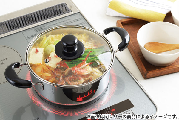 | 材質 | 本体:ステンレス3層鋼、内面:ミラー仕上、フタ:強化ガラス、ハンドル・つまみ:フェノール樹脂 |