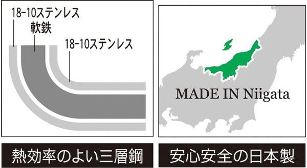 ●熱効率のよい3層鋼なので、素早くムラなく熱を伝えます。