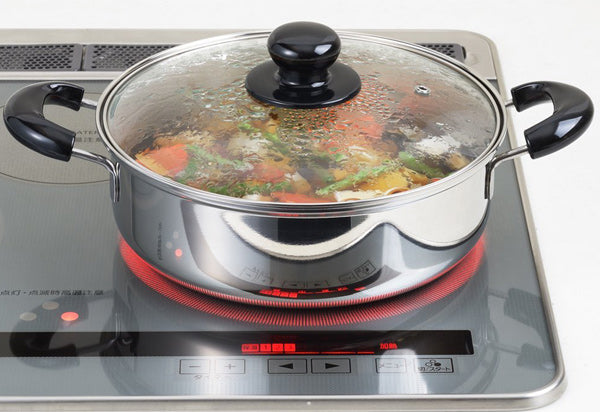 製品安全協会「クッキングヒーター用SG基準」の認定を受けており、200V熱源にも安全にお使いいただけます。また、ガス火はもちろんIH調理器にもご使用可能です。
