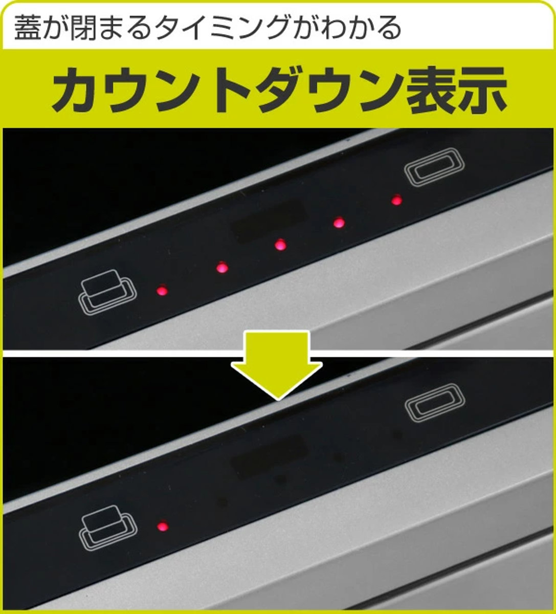 デジタルパネルにカウントダウンが表示されるので、蓋が閉まるタイミングがわかります。勝手に閉まって手をはさむ、なんて心配はいりません。センサーが検知を終えると、5秒後に蓋が閉まります。