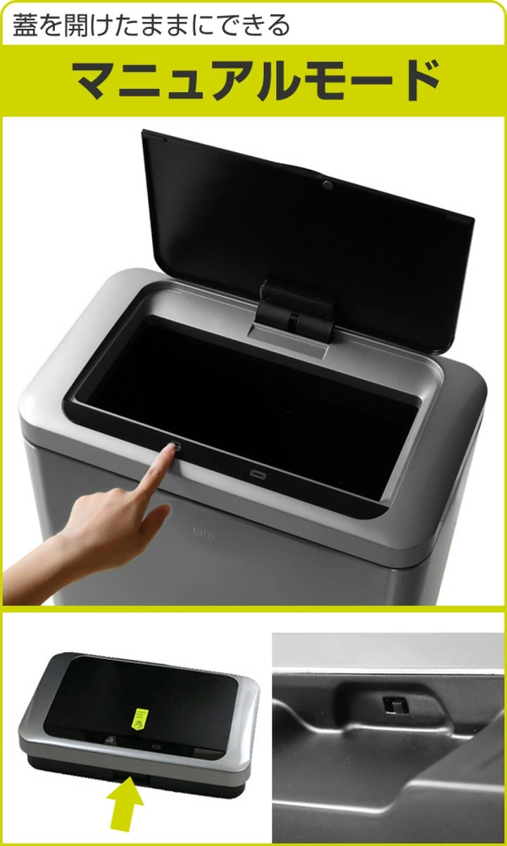 蓋の裏の小さなスイッチを操作することで、マニュアルモードに切り替えることができます。蓋を開けたままにできるので、ストレスを感じずに作業ができます。用途に応じて、使い分けることができるのでとても便利です。