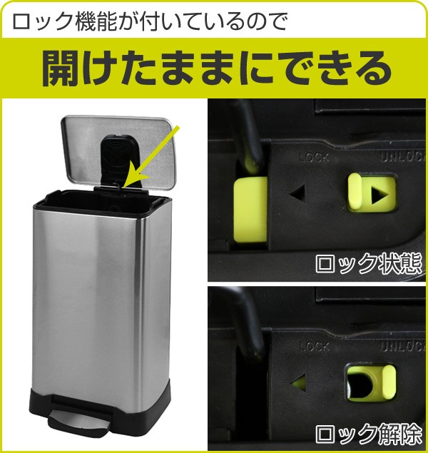 ロック機能が付いているので、ペダルから足を離しても蓋を開けた状態にできます。生ゴミの処理など、作業しながらのゴミ捨てが簡単にできます。