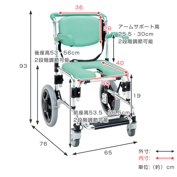 | サイズ | 約 幅65×奥行76×高さ93(cm) 前座高53.5、56.5(cm) 後座高53、56(cm) 座面幅40×40(cm) 背面サイズ:幅36×高さ26(cm) アームサポート高25.5、30(cm) フットサポート高19(cm) |