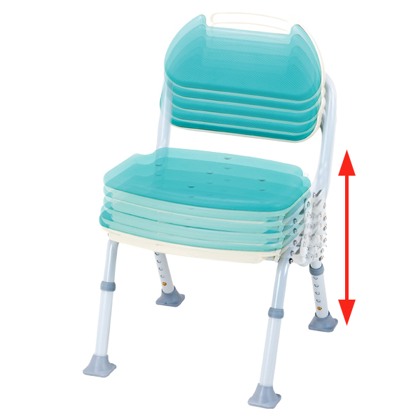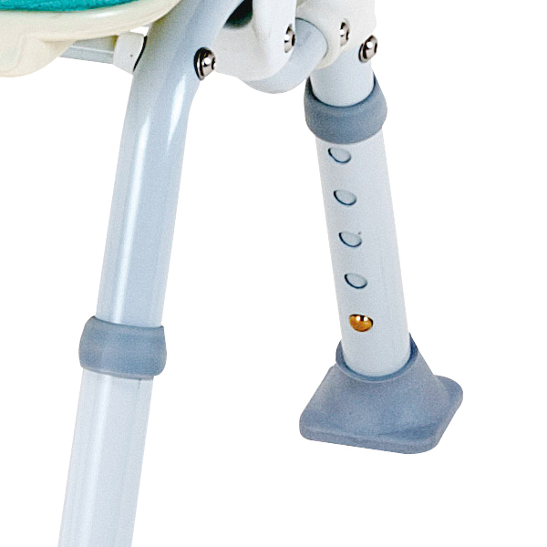 シャワーベンチの座面高さは5段階で調節ができます。脚のプッシュボタンで2.5cm間隔で高さを調節、ご使用になる方の座りやすく、立ち上がりやすい高さに調節することでより快適にお使いいただけます。