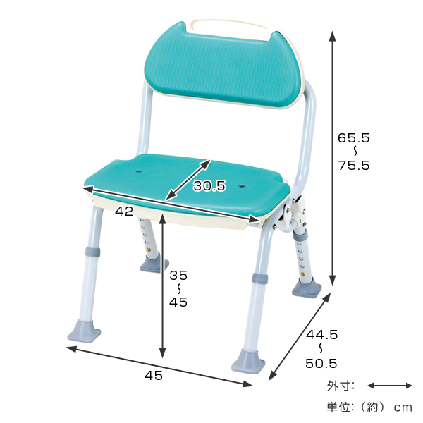 | サイズ | 約 幅45×奥行44.5×高さ50.5(cm) 折り畳み時:約幅45×奥行21×高さ76.5(cm) 座面高35~45(cm) 座面サイズ:42×30.5(cm) |
