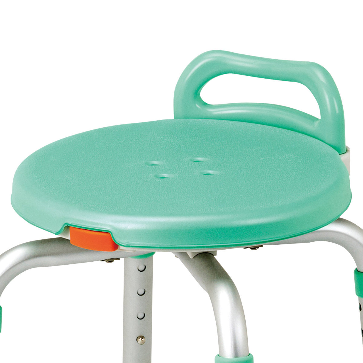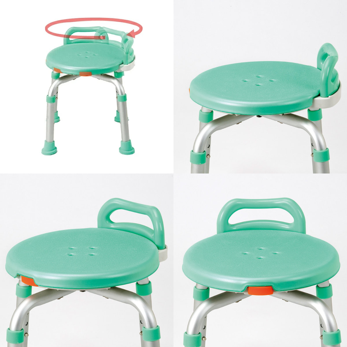 回転チェアの座面は90度ずつ360度回転します。簡単に回転させることができるので、身体の向きを自力で変えるのが難しい方や、脱衣所から浴室、浴室から浴槽への方向転換も楽に行うことができます。