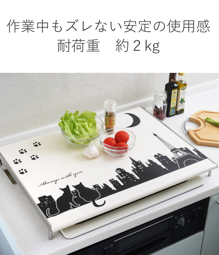 料理中は調理台に物があふれがちですが、コンロの上まで使えると広々として調理の効率もアップします。強力なシールで固定するので、作業中も動かず安定します。